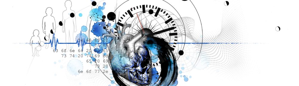 Conceptual drawing of Willow's chest piece. Includes a skull in a heart, a person growing up, a heart beat, ASCII hex code that says "the second best time is now", a clock before a sunburst, and paint splatters.